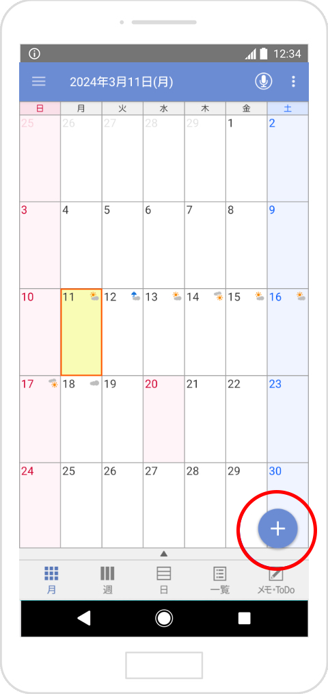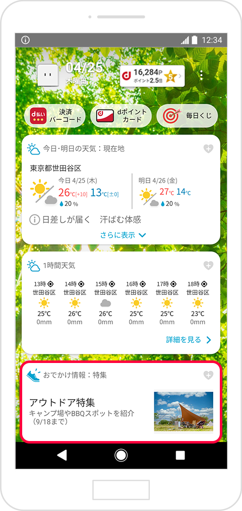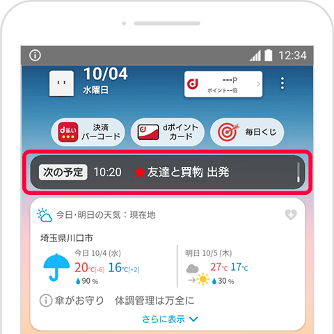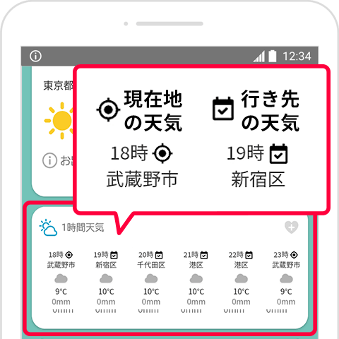 1時間天気にスケジュールに登録された場所の天気が表示されます。