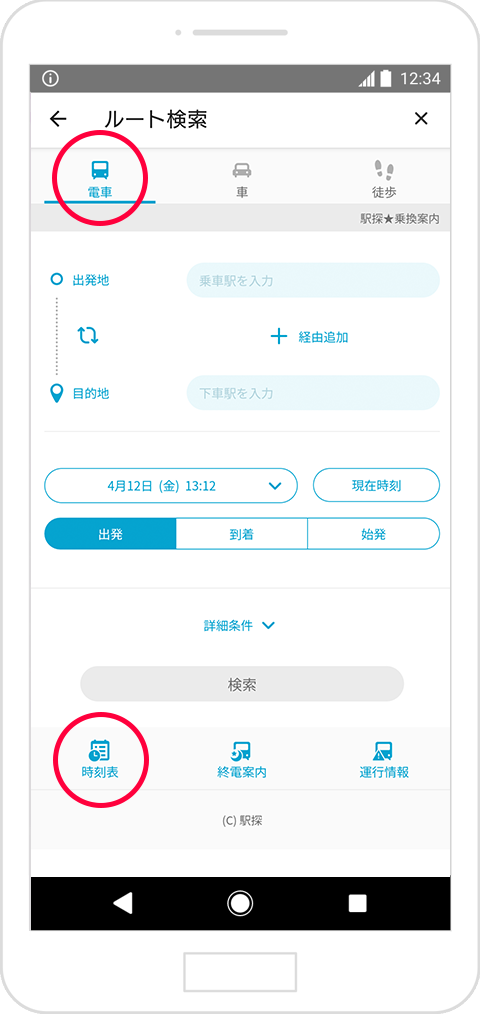 ※my daizアプリが起動します。※ご使用の状況によって「車」「徒歩」のページに遷移する場合もございます。その場合は、上部の「電車」ボタンを押してください。