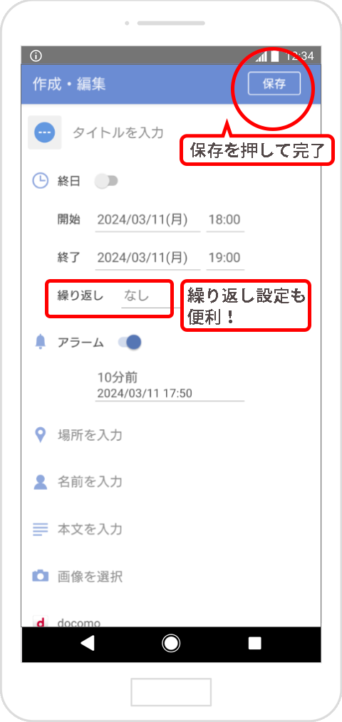 繰り返し設定も便利です。最後に右上の保存ボタンを押したら完了です。
